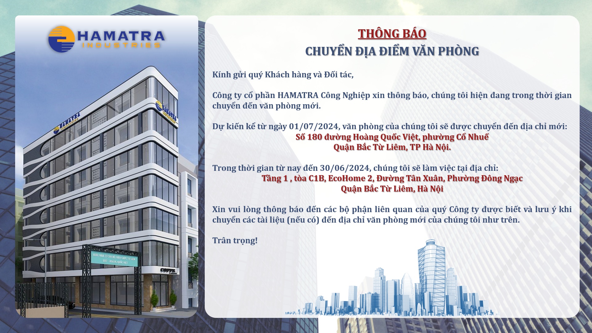 Công ty Cổ phần HAMATRA Công Nghiệp xin trân trọng thông báo về việc thay đổi địa chỉ văn phòng giao dịch như sau: